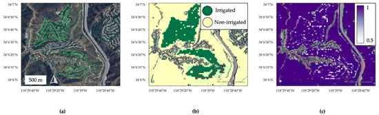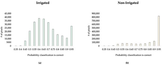 30] with 30 ensembled decision trees. This is the default random forest (RF) algorithm in Google Earth Engine and was used to classify all of SoCAB at 30 m resolution. In addition to the binary irrigated/non-irrigated classification, GEE’s RF implementation outputs the per-pixel probability that a given classification is correct. Thus, we were able to identify the probability that each vegetated pixel was classified correctly as either irrigated or non-irrigated. The typical threshold for defining a pixel as irrigated or non-irrigated in GEE is greater than 0.5, i.e., a pixel with a 0.55 probability of being irrigated is classified as an irrigated pixel.