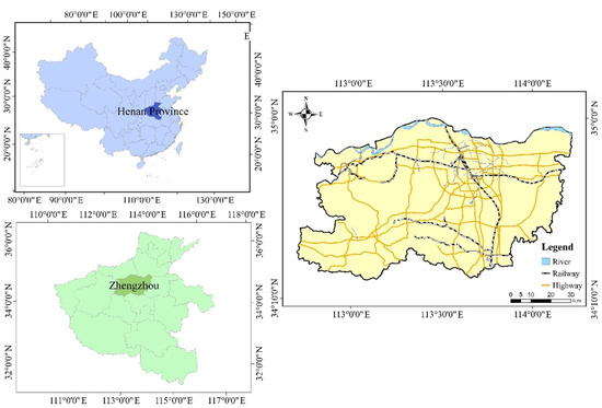 Zhengzhou, located in the hinterland of the central plains, is an important, central city in central China, and is the center for the politics, economy, culture, transportation, communication, and technology in Henan Province. Zhengzhou is located between east longitude 112°42′−114°13′ and north latitude 34°16′−34°58′ (see Figure 1). It is 137.132 km wide from east to west and 80.792 km long from north to south. The administrative area of Zhengzhou covers a total area of 7446 km2, and the urban area is 1010 km2. Zhengzhou is divided into one main urban area, five county-level cities, and one county. The main urban area includes six municipal districts: Jinshui District, Erqi District, Huiji District, Zhongyuan District, Guancheng District, and Shangjie District. The five county-level cities include Dengfeng, Gongyi, Xinmi, Xingyang, and Xinzheng, and there is one county in Zhongmu County. From 2010 to 2017, Zhengzhou’s urbanization construction land increased from 315.7 km2 to 549.33 km2. Compared with 2010, the area of urban construction land in the main urban area increased by 54.1 percent in 2017.