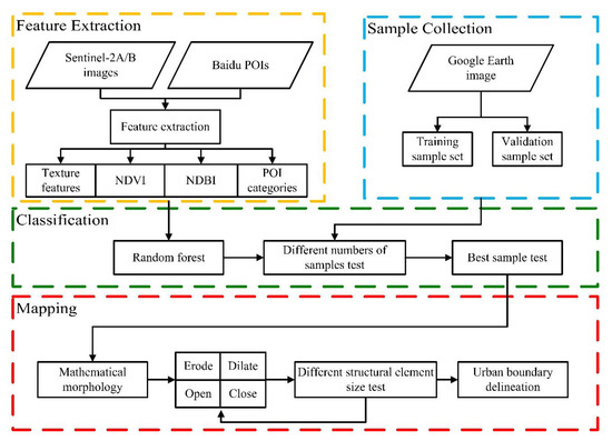 In this study, we apply multi-dimensional features formed by multi-temporal Sentinel-2 data and POI data. We achieve highly precise small-scale urban boundary mapping through the RF algorithm and mathematical morphology. Many scholars have made use of multi-source remote sensing images of various scales and social auxiliary data such as POI to achieve large-scale, high-resolution, high-precision land cover mapping and impermeable water surface mapping [12,13,14,15,16,17,18,19,20,21,22]. The accuracy of small- and medium-scale urban boundary mapping has not been improved to any obvious extent. As a matter of fact, there is no high-precision urban boundary mapping product that can be used exclusively for small-scale regional applications. Compared with the previous products, we proposed a process of urban boundary mapping for small and medium scales. Furthermore, the resolution and accuracy of the products that we have produced have been improved greatly [26,27,28,29,30,31,32].