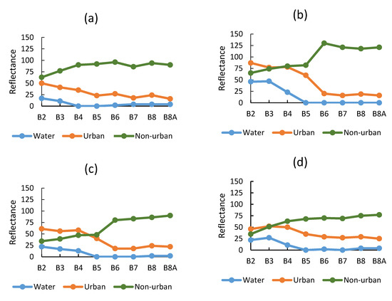 Spectral curves of the three types in the study area on (a) 22 February 2018, (b) 7 June 2018, (c) 30 September 2017, and (d) 19 November 2018.