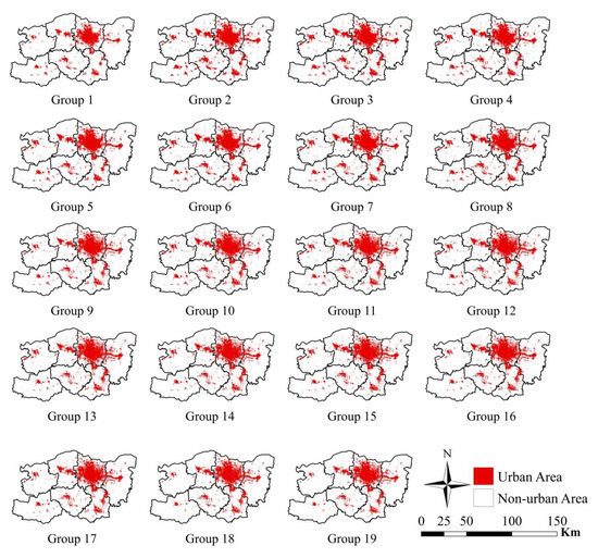 The training results from each group are shown in Figure 5. The results of the urban construction land extracted are in line with the actual situation, and the main urban areas and the patches of urban construction land in county-level cities are relatively clear. Due to the different numbers of training samples in each group, the training results from the model were slightly different, with no significant difference inside the plaque and a significant difference at the main plaque boundary. There is also some noise inside the patch. Some areas within the urban boundary that belong to the urban area are classified as non-urban areas by the model, which may be related to the selection of training samples. The edges of the urban patches in the main urban areas and county-level cities are very messy and fragmented.