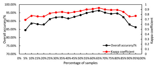 By establishing a confusion matrix and calculating the Kappa coefficient to evaluate the accuracy of the urban construction land extraction results of each group, different results are obtained (Figure 5). Figure 6 shows the comparison of the overall accuracy (OA) and the Kappa coefficients of the training samples and verification samples with different sampling ratios. We found the following: (1) the OA increases with the increase in the number of samples; (2) when the number of training samples is increased to 130, which includes 65 training samples and 65 verification samples, and the training samples account for 65% of the sample data set, the model has the highest accuracy, reaching 96.25%, and the Kappa coefficient is 0.93; (3) when the number of training samples exceeds 130 and continues to increase, the OA begins to decline significantly.