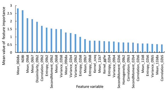 In general, there are 31 features that contribute more than 0.5, including 28 texture features, one build-up index feature, and two POI features. The significance of Mean_06b8a, NDBI mean, Mean_09b8, and Mean_06b7 are the greatest, indicating that the mean value of band 8a in June, the NDBI mean, the mean value of band 8 in September, and the mean value of band 7 in June make the greatest contribution to the extraction of urban construction land. The visible light band, red edge band, and near-infrared band have a significant effect on land cover classification. The mean of the GLMC reflects the mean value of the gray scale of the image elements, which is the brightness feature of the images, and makes a significant contribution. It can be seen that there is a significant difference in the brightness of the remote sensing images of urban construction land and non-urban construction land, which is conducive to distinguishing between them. Dissimilarity_09b2, Correlation_09b2, Entropy_09b2, and SecondMoment_09b2 contribute significantly and equally to the extraction of urban construction land.