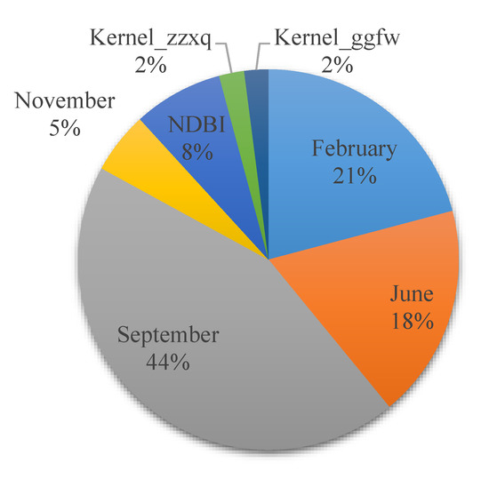 The importance of different features to classification is quite different. In our result, both the texture features of multi-temporal Sentinel-2 image data and POI features contribute to the identification of urban construction land. Among the 31 features whose contribution was greater than 0.5, the contributions of the texture features in February and September were the largest. In the texture features, the mean value of the GLCM contribution is obvious. Compared with Sentinel-2 image data, POI features have little influence on the extraction of urban construction land. Among the POI features, different types of POI have significant differences on importance. The two types of POI; namely, residential communities and public services, contribute the most to the classification of urban construction land, while the other three types (the administrative center, commercial centers, and transportation) contribute less than 0.5, and so are relatively less important.