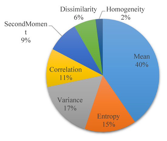 All texture features of the four time-phase images contribute to the identification of urban construction land. Multi-temporal images play an important role in the classification of urban construction land, which reflects the importance of texture features in increasing the classification accuracy, and are suitable for the urban land use classification of high-resolution image. Among the 28 texture features whose contribution is greater than 0.5, there are nine mean values, five entropies, five variances, four correlations, three second moments, one dissimilarity, and one homogeneity (see Figure 7). The texture features of September contributed the most in the first 31 features, followed by February, June, and November (see Figure 8). Also, the mean value contributed the most among 28 texture features in the first 31 features, followed by variance, entropy, correlation, second moment, dissimilarity, and homogeneity (see Figure 9).