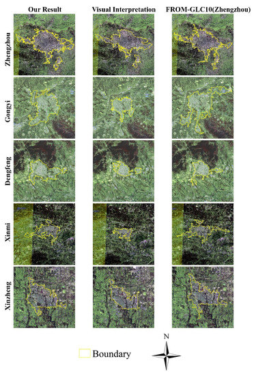 From Figure 11, it can be seen that there is a difference between our results and other products. A visual interpretation is the result of complex analysis by the human brain. Our result is based on machine learning and does not learn urban structure as deeply as the human brain. On the whole, the boundary we have delineated is larger than the results of the visual interpretation product and is slightly different from FROM-GLC10 products.