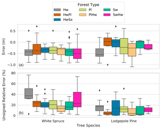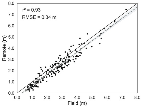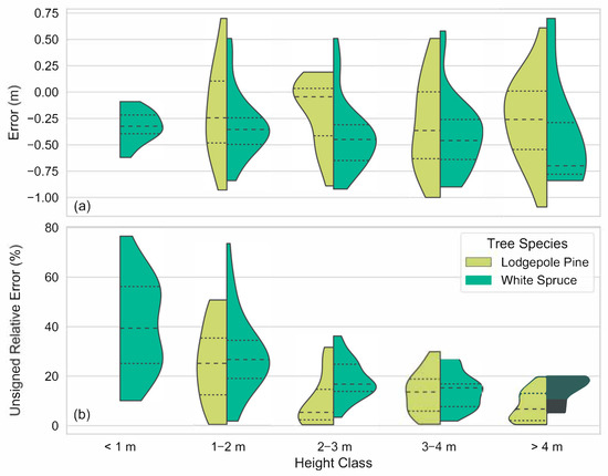 Our height measurement analysis found field and remote height measurements to be highly correlated (r2 = 0.93). Remote height measurements tended to underestimate field height measurements (162/194 samples) and mean error was greater for white spruce trees than it was for lodgepole pine (−0.37 m and −0.24 m, respectively). We speculated as to why the majority of remote height measurements underestimated their corresponding field samples as well as why lodgepole pines may be less underestimated than white spruce, and we offered suggestions for future studies to address this challenge. Furthermore, we observed that remote height measurements may overestimate their corresponding field height measurements when a delineated conifer crown contains pixels belonging to taller, adjacent coniferous or deciduous trees.