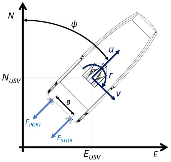 This article uses an under-actuated USV as the primary vehicle in the co-operative autonomous offshore system. The USV is an aluminum hull with a thrust vectoring waterjet propulsion system, which provides optimal maneuverability using a twin waterjet configuration. Figure 1 shows a simplified model of the vehicle, where the port and starboard (STDB) waterjets produce the necessary thrust forces to move forward, backward, sideways or performing turns. Additionally, Figure 1 includes the position and orientation of the USV in the North-East-Down (NED) coordinate system. The NED coordinate system is related to planar Cartesian coordinates, so a coordinate transformation is performed from the GPS-compass output to get the USV’s absolute position. This transformation is between longitude and latitude (l, ) from the world geodetic system 84 (WGS84) coordinate system and ETRS-TM35FIN [22], which displays the NED position (, ). The Euler angles provide the USV heading or yaw angle . The motion of the USV has three DOFs, which are surge, sway, and yaw (linear (u, v), and angular r velocities) while ignoring roll, pitch, and heave motions.