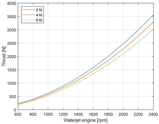 The thrust forces and torques for the mathematical model of the USV are defined according to the manufacturer’s data and an affinity law. Thus, a two-dimensional (2D) lookup table can include the relation between the shaft rotational speed of the waterjet engine N with the thrust force per waterjet F. The affinity law used to obtain the thrust force at the waterjet units is defined by
