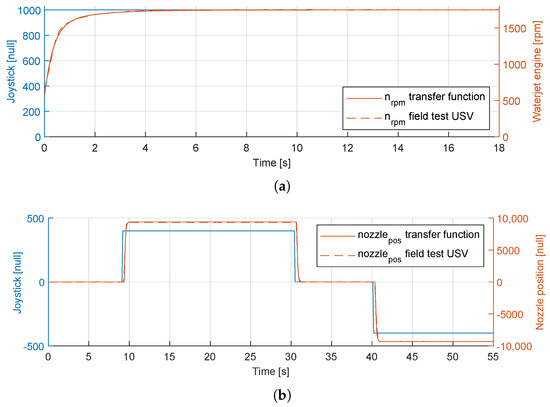 Comparison between the USV field test data and the system identification (SI) transfer functions: (a) Engine rpm . (b) Nozzle position .