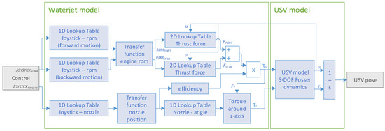 Figure 4 shows the schematic with all the necessary functions for the USV dynamic model, from the joystick controller input to the vehicle’s position output. The waterjet model includes the 1D lookup table to translate between joystick commands to rpm, the second-order transfer function, and the 2D lookup table related to the thrust force of each waterjet unit. Furthermore, it also includes the 1D lookup table to translate between joystick commands to the nozzle position, the first-order transfer function, the thrust force efficiency depending on the nozzle position, and the calculation of the total torque. Both thrust force and torque are the inputs in the mathematical model of the USV based on the three DOFs dynamic model. The position and orientation of the USV are performed by integrating the velocity vector .