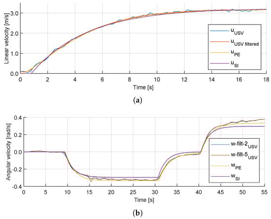 Figure 5 shows the comparison between the field tests, which include raw and filtered USV linear and angular velocity, the three DOFs dynamic model with the coefficients obtained from the parameter estimation, and the SI results from [10], for the joystick controller input shown in Figure 3. As shown in both linear and angular velocities results, the parameter estimation results improve the previous SI approach, giving an accurate output of the USV maneuvering compared to the field test results.
