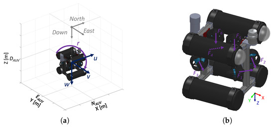 Six-thruster configuration in the AUV: (a) Simplified model of the considered vehicle using the NED coordinate system. (b) Thrust forces with their direction for each thruster.