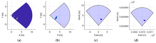 Figure 7 shows the steps from the scan data obtained from the mechanical imaging sonar in the BODY reference frame to the final origin position of the detected targets. Figure 7a shows the raw data from the mechanical imaging sonar. Then, Figure 7b shows the post-processing described in Algorithm 1. Finally, Figure 7c,d represents the origin position of the targets in NED coordinate system, with relative to origin [0,0] and absolute coordinates respectively.