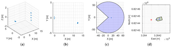 The algorithm for target detection is similar to the described for the mechanical imaging sonar. The only difference is that the LiDAR contains four spread-out scan planes, acquiring three-dimensional (3D) scan data (see Figure 8a). The target detection algorithm is simplified by translating the received data to 2D by avoiding the z-axis from the sensor data (see Figure 8b). Figure 8c shows the maximum detection range and aperture angle with the scan data in the BODY reference frame. Finally, Figure 8d shows the origin’s position of the targets in the NED coordinate system after applying Algorithm 2.