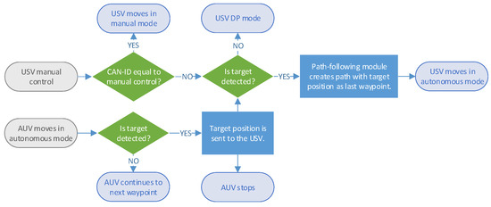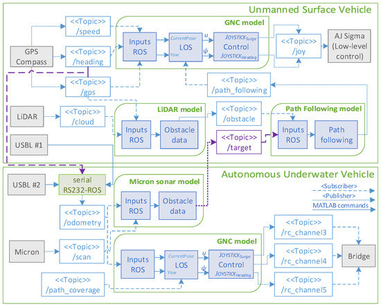 Regarding the USV, the exchanged ROS topic contains the target’s origin position. Thus, once this topic is received in the path-following model, it defines the necessary waypoints to perform the autonomous mission. These waypoints are sent to the GNC model, where the LOS-algorithm calculates the required course angle for the controller. Finally, the controller generates the required joystick commands for surge and yaw to reach the LOS values. These joystick commands are sent to the low-level control (display computers) to perform the autonomous USV operation, using the same outputs as a manual three-axis joystick.