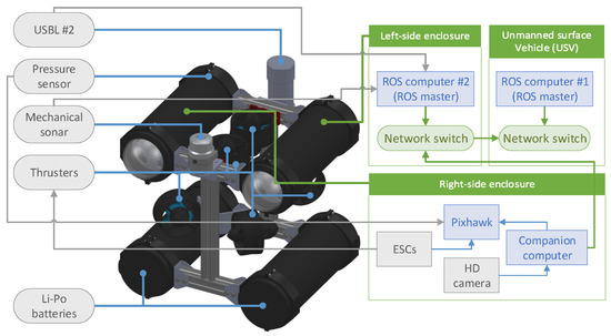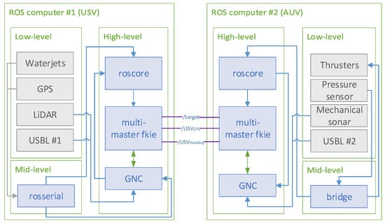 Due to the co-operative offshore system in this study, it becomes necessary to fuse information obtained from the individual vehicles. Robot Operating System (ROS) has been an effective tool when working with multi-robot systems. This tool is a flexible framework for writing robot software and provides the tools to acquire sensors’ data, process it, and generate the necessary response for the vehicle actuators [19]. Multi-robot systems can either be centralized with a ROS master node at the ground control station (GCS) or decentralized with each autonomous vehicle (AV) running an independent ROS master. In the case of the decentralized control techniques, they are more flexible, profitable, and generally reduce the communication network requirements compared with centralized control [20]. However, they are also more challenging due to obstacles, uncertainties, and communication constraints, such as noises, delays, dropouts, or failures. In this case, the multi-master approach provides a solution where each vehicle keeps its own ROS master and also exchange the necessary information with other components of the multi-robot system. In [21], they proposed a package that efficiently developed multi-master architectures.