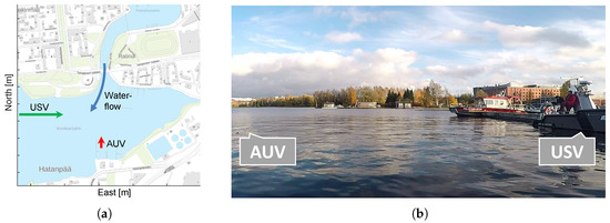 Control scenario: (a) Location of the AUV (red arrow) and USV (green arrow) field tests at the Pyhäjärvi lake in Tampere, Finland, being affected by the water-flow (blue arrow) from a hydro-power plant. (b) AUV and USV platforms at the harbor during the AUV field tests.