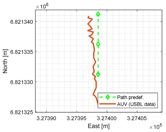 The first step in the target detection algorithm is the AUV path-following. This module is tested at the harbor with a set of three waypoints defined in the NED coordinate system. The surge motion has a constant PWM value to the thrusters, and the yaw and heave motions are implemented using separate PID controllers. The LOS-based guidance system calculates the necessary course angle to reach every waypoint of the predefined path. Figure 15 shows the AUV trajectory using the USBL data for navigation, where the AUV initial position and orientation are defined as random. The AUV moves slightly to the left side of the path-following due to the environmental drift forces. As it is shown in Figure 14a, the field tests have been done in an estuary area of a narrow and shallow lake, where the flow from a hydro-power plant affects considerably. These flow conditions vary depending on the river discharge rate. During the time of testing, the river discharge was 38 m3/s to the south direction, and the wind speed was equal to 6 m/s with southwest wind direction.