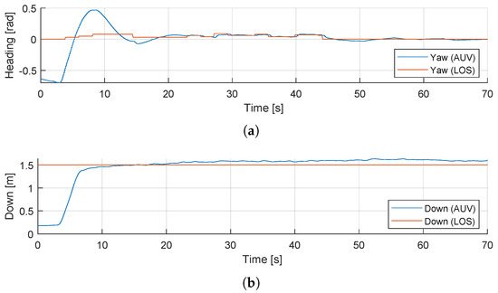 AUV Control scenario: (a) Comparison of heading angle from the LOS guidance system with field-test data. (b) Comparison of the constant depth of 1.5 m with field-test data.