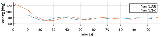USV Control scenario: Comparison of heading angle from the LOS guidance system with field-test data. After reaching the position, the yaw angle is equal to the constant velocity-path relative angle for DP mode.