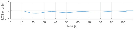 USV Control scenario: LOS cross-track error for the lookahead-based steering law defined in (22). This error is produced by the environmental variables, as the drift angle is not included in the LOS-based guidance control.
