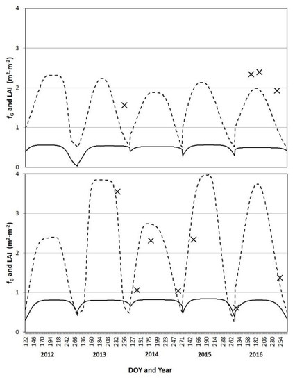 Time series of LAI from the MODIS product used to partition soil and canopy temperatures (Equation (2)) captured seasonal dynamics from green-up to senescence for the whole period at both flux towers (Figure 3). Moreover, comparison with in-situ field estimates of LAI (not originally intended for LAI MODIS product evaluation) yielded a reasonable error with a RMSE of 0.7 and 0.6 and an MBE of −0.7 and 0.2 at the black spruce and birch sites, respectively. For black spruce, fG computed using Equation (15) a good correspondence with LAI dynamics for the whole growing period (May to September) was found. The birch site showed a similar behavior from June to August. However, in May and September the pattern was different due to an already green understory with low LAI in leaf-out and senescence (Figure 3 lower panel and especially visible in 2013).