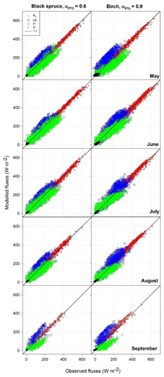 Monthly estimation of RN, LE, H, and G with adjusted αPTC and the modified G configuration showed an acceptable overall agreement with observations from June through August (months with the greatest vegetation activity in the boreal forest), with RMSE values lower than 50 W·m−2 and an mean MAPD around 23% (Table 3 and Table 4, and Figure 4). However, model performance deteriorated to some extent at leaf-out and at senescence. During these periods, LE was overestimated by the model, and H underestimated. This may be related to unreliable estimates of fG or αPTC at the start of leaf-out and at the end of the senescence periods.