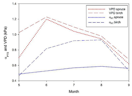 Due to the lack of αPTC values in the literature, a first approach to understand its seasonal behavior is assuming αPTS computed in Equations (16) and (17) with flux tower data as representative of the αPTC behavior. Results showed that from June to August αPTS values were similar to other studies and used in this study to model turbulent fluxes with a value of 0.89 ± 0.05 for birch and 0.56 ± 0.03 for black spruce (Figure 5). However, in the leaf-out and senescence (May and September) αPTS yielded lower values. For black spruce, values were 0.49 and 0.56, similar to the reference αPTC value of 0.6 used to estimate LE. However, for birch values were almost half of the reference αPTC value of 0.9 that was used, 0.47 and 0.53, respectively, similar to those reported in other boreal deciduous forests [82]. In both cases, αPTS behaved according to VPD.
