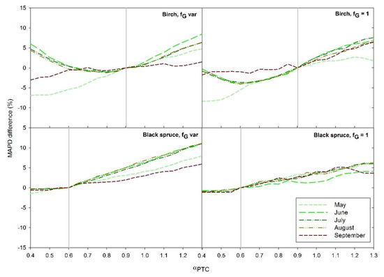 To further evaluate the sensitivity of choice of αPTC on LE estimation, differences in MAPD obtained using a range in αPTC from that obtained using the reference values of 0.6 and 0.9 for black spruce and birch, respectively, are shown in Figure 7. MAPD for black spruce was almost insensitive to use of lower values of αPTC, and errors increase steadily for αPTC above the reference value. This suggests that an initial αPTC value of 0.6 should be used for modeling black spruce water use. For all values of αPTC, applying a variable fG improved the LE estimation as already reported by [41]. Birch showed similar pattern from June to August, with an αPTC of around 0.8. However, the error difference within a αPTC interval from 0.8 to 1 in absolute value was around 1%, steadily increasing when lower and higher values were applied. This suggests that an initial αPTC mean value of 0.9 found in the literature may be applied to model LE regionally for birch. However, in May, αPTC lower values of 0.5 yielded a 7% improvement while in September of around 2%, suggesting that a value of 0.5 would be more appropriate to estimate LE. This moderate improvement in September could be related to the issues in capturing fG dynamics at the end of the season due to an already green understory but with low evaporation rates, although more research is needed.
