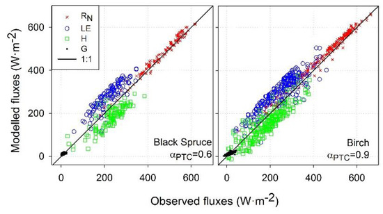 For birch and black spruce, RMSE for LE and H for the original αPTC configuration ranged from 64 to 77 W·m−2, while for the adjusted αPTC configuration LE and H ranged from 41 to 49 W·m−2, errors comparable to those described in other studies [75], and according to [76] after daily integration of instantaneous daytime fluxes the errors will tend to be reduced on the order of 10–15%. The error percentage (MAPD) in LE and H using the adjusted αPTC values were also reduced from 32% to 39% to less than 25%. For both original and adjusted αPTC values, the model tended to overestimate LE and underestimate H. Model LE and H under- and overestimation may be also explained due to the lack of instrument closure and methodological uncertainties, insufficient estimation of storage terms, unmeasured advective fluxes, landscape scale heterogeneity or instrument spatial representativeness, among others [67,68,70,77,78].