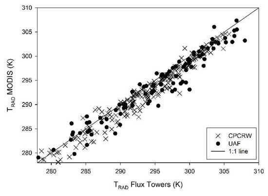 Comparison of MODIS TRAD estimates with flux tower TRAD observations yielded a RMSE and a MBE of 1.9 K and −1.3 K at the birch site, respectively, and a RMSE and a MBE of 2.2 K and −1.3 K, respectively, at the black spruce site (Figure 9), thus, underestimating ground estimates of TRAD. This resulted in an increased bias and error in LE and H estimation lowering the final agreement. Therefore, to avoid an increase in bias on TRAD, for circumpolar boreal regions an alternative time-differential TSEB technique using a dual-time difference (DTD model) in observed TRAD and air temperature [41,83] will be implemented adding the model modifications found in this paper.