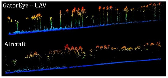 Examples of GatorEye UAV-LiDAR (up) and aircraft LiDAR (bottom) point cloud profiles. Returns colored by height. Quick Terrain Modeler software’s visualization.