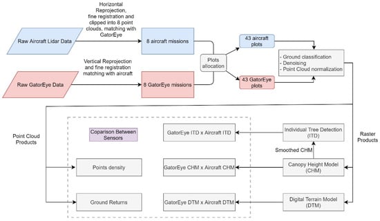 Methods workflow, from raw data to LiDAR products sensor comparisons. In red, GatorEye’s and, in blue, aircraft LiDAR data pre-processing.
