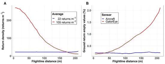 GatorEye UAV-LiDAR (red) and aircraft LiDAR (blue) return density (A) and ground returns (B) along the flightline distance.