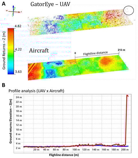 (A) Example of one rectangle plot (130 m × 430 m) showing GatorEye UAV-LiDAR and aircraft LiDAR ground returns along flightline distance, and misclassification for GatorEye in wide angles (highlighted by the black circle). (B) Ground return profile analysis (Red = UAV, Blue = aircraft), and the abrupt increase in the GatorEye ground elevation return after 200 m from the flightline. Rectangle plots, scales, and profile analysis charts were captured from the Quick Terrain Modeler software.