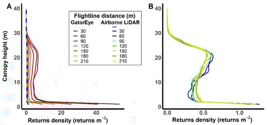 Besides the differences in point cloud density, both sensors have shown similar behavior patterns for the returns profiles (Figure 6 and Figure 7), which are basically defined by first returns, except the ground returns, in which the high-density returns are shared with the second return (Figure S1). This pattern is most apparent within a 120 m distance of the flightline, where the relative return density curve starts to change between heights of 5 to 15 m. After this threshold, the GatorEye curves start to flatten, and aircraft return density keeps the same pattern across all flighline distances (Figure 7). The GatorEye point cloud had a higher return density within 1 m height, where it observed more than 50 pts·m−2 up to 30 m distant from the flightline, compared with the aircraft LiDAR’s average of 1.25 pts·m−2, which is more than 40 times the average density for the same height and distance (Figure 6). This is the major difference between sensors as seen in the 12 first charts of Figure 7, where the proportion of returns close to the ground is always greater in the GatorEye system. The behavior shown in Figure 6 reinforces the disparity in return density between the sensors, also shown in Figure 4A, with the added context of how these returns are spread throughout the canopy height.