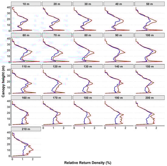 GatorEye UAV-LiDAR (red) and aircraft LiDAR (blue) relative return density along the distance from the flightline. Each chart is titled with the respective distance from the flightline that the point cloud was filtered, varying from 10 to 210 m. The X axis brings the relative returns density that floats from 0 to approximately 3%. The Y axis presents the height of the canopy, ranging from 0 to almost 40 m.