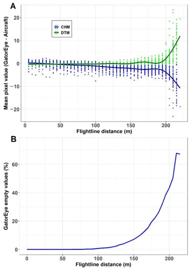 Compared to the DTM derived from aircraft sensor data, GatorEye single-pass derived DTM presented underestimated mean ground elevation by 0.29 ± 0.17 m at 5 m flightline distance and then followed no trend until 140 m, where the difference between sensors mean pixel value was found to be −0.02 ± 0.37 m, growing to 0.02 ± 0.39 at 145 m, 0.35 ± 0.71 m at 170 m, 0.94 ± 1.17 m at 195 m, and 1.56 ± 2.34 m at 200 m from the flightline. After this, GatorEye overestimation became much higher, as much as 9.20 ± 5.04 m at 215 m (Figure 8A). In the 1 m pixel resolution, CHM analysis sensors presented differences of the mean pixel value of about 0.25 ± 1.13 m at 5 m flightline distance and −0.98 ± 1.29 m at 95 m. GatorEye begins to underestimate the canopy height at 120 m compared to the CHM derived from aircraft sensor data, with 1.62 ± 1.45 m differences. This underestimation trend continues with differences of 2.57 ± 1.57 at 175 m, 3.35 ± 1.96 at 200 m, and 9.03 ± 5.07 at 215 m distance from the flightline (Figure 8A). The aircraft CHM did not present empty pixels, while the percentage of empty pixels in the GatorEye CHM increases exponentially with flightline distance. At 100 m, the percentage of empty pixels start to increase from around 0% to around 2% at 120 m, and then to greater than 40% at 200 m (Figure 8B).