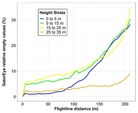 Percent of empty voxels from GatorEye UAV-LiDAR stratified CHM by flightline distance for four height strata.