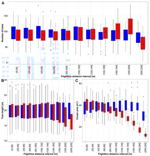 GatorEye (red) and aircraft LiDAR (blue). (A) Difference in the numbers of tree detection between sensors along flightline distance. (B) Average of trees’ heights along the distance from the flightline. (C) Average of trees’ crown area along the distance.