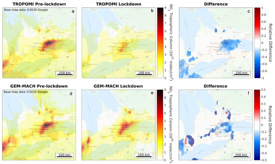 TROPOMI averaged VCDs over southern Ontario are shown for (a) a pre-lockdown (16 February–15 March 2020) and (b) a lockdown (16 March–8 May 2020) period. The relative differences ((lockdown-pre-lockdown)/pre-lockdown) are shown in panel (c) for areas that exceed molec/cm in the pre-lockdown period. Panels (d–f) are the same but for the operational GEM-MACH model BAU NO VCDs, sampled at the time and location of the TROPOMI pixels.