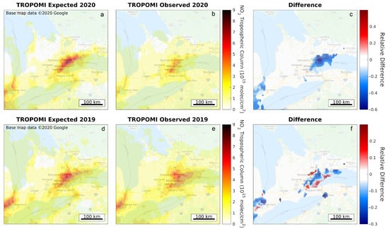 The figures show the expected and observed TROPOMI averaged NO2 VCDs over southern Ontario for 2020 and 2019. Expected and observed TROPOMI average VCD fields for the lockdown period (16 March–8 May 2020) are shown in panels (a,b), respectively. The same is shown in panels (d,e), but for 16 March–8 May 2019. Relative differences ((observed-expected)/expected; for areas that exceed molec/cm) between the TROPOMI observations and the expected columns are shown in panel (c,f) for 2020 and 2019, respectively. Note that panel (b) is the same as Figure 1b.