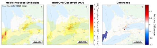 As a test of the methodology to create expected TROPOMI columns for the COVID-19 period from the change in the model forecasts, the same procedure was applied to TROPOMI observations and operational GEM-MACH output from 2019. In this case, differences between expected and TROPOMI observations should be minimal, because no unusual emission reductions occurred in 2019. As can been seen in Figure 2d,e, differences are small, suggesting the method is generally reliable. Averaged over the GTA, differences are 0–2%.