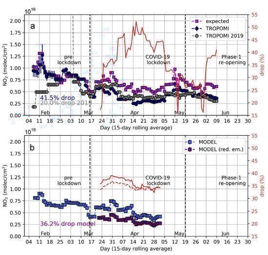 When averaging over time to produce spatially resolved maps, observations from 15 February to 15 March 2020 and 16 March to 8 May 2020 are used for the pre-lockdown and lockdown time periods, respectively. This end date is associated with some traffic rebound and increased emissions throughout May 2020 (see Section 3). When averaging over a larger area to produce a time series, 15-day running means are used (the satellite data need to be averaged over multiple days in order to obtain enough data over this area, approximately 50% of observations are filtered due to clouds). The expected columns for the 15-day running means are estimated as in Equation (1), where and are the 15-day means for a specific day.