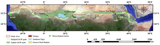 Geographical location of the study area, meteorological stations, three selected areas (Niamey, Eastern Wad Madani, South Niger), original Great Green Wall (GGW) path and updated GGW path.