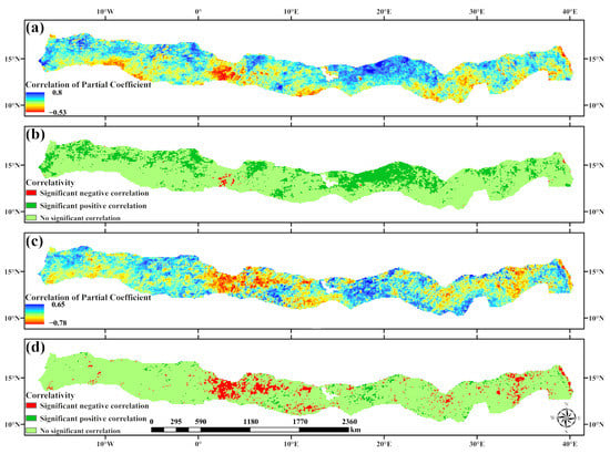 (a) Coefficient of partial correlation between precipitation and NDVI from 1982 to 2015. (b) Significance testing of partial correlation between precipitation and NDVI from 1982 to 2015. (c) Coefficient of partial correlation between temperature and NDVI from 1982 to 2015. (d) Significance testing of the partial correlation between temperature and NDVI from 1982 to 2015.