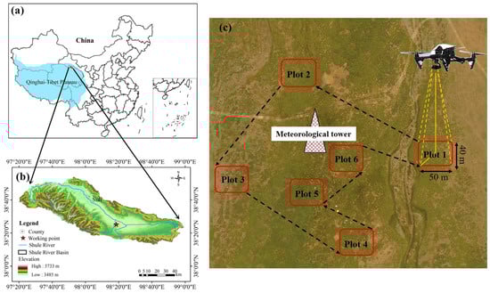 (a) Source region of the Shule River Basin and its location on the Qinghai-Tibetan Plateau and China; (b) working point (red pentagram) in the source region of Shule River Basin; (c) irregular flight way with 6 fixed sampling plots. Red boxes represent the plots (~50 m × 40 m).