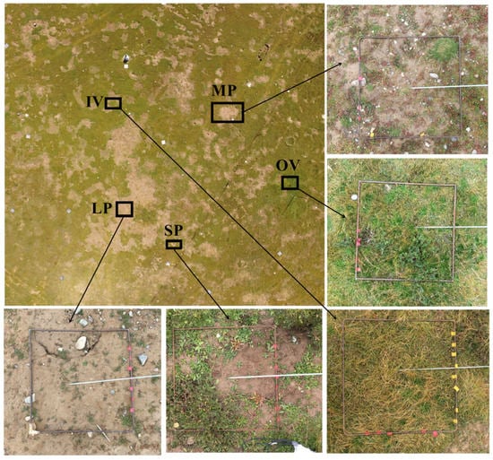 The vegetation patch pattern was relatively stable [26,27], and the variations during the vigorous growth stage were small [20]. Given that the vegetation cover usually peaks at the end of July and beginning of August on the QTP [20,28,29], we chose six sampling plots (~50 m × 40 m) around the meteorological tower to conduct field work during June to August 2018 (Figure 1c). The effects of patchiness on SSM were evaluated by classifying the land surface into five typical patches: (1) original vegetation patch (OV, intact vegetation patch and patch size larger than 20 m2), (2) isolate vegetation patch (IV, vegetation patch surrounded by bare soil and patch size less than 20 m2), (3) large bare patch (LP, with patch size larger than 9.0 m2), (4) medium bare patch (MP, with patch size of 1.0–9.0 m2) and (5) small bare patch (SP, with patch size less than 1.0 m2) (Figure 2). At all sampling plots, aerial photogrammetry and field measurements were conducted simultaneously.