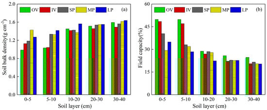 Variations of (a) soil bulk density and (b) field capacity among the five typical patches. OV, IV, SP, MP and LP mean original vegetation patch, isolate vegetation patch, small bare patch, medium bare patch and large bare patch, respectively.